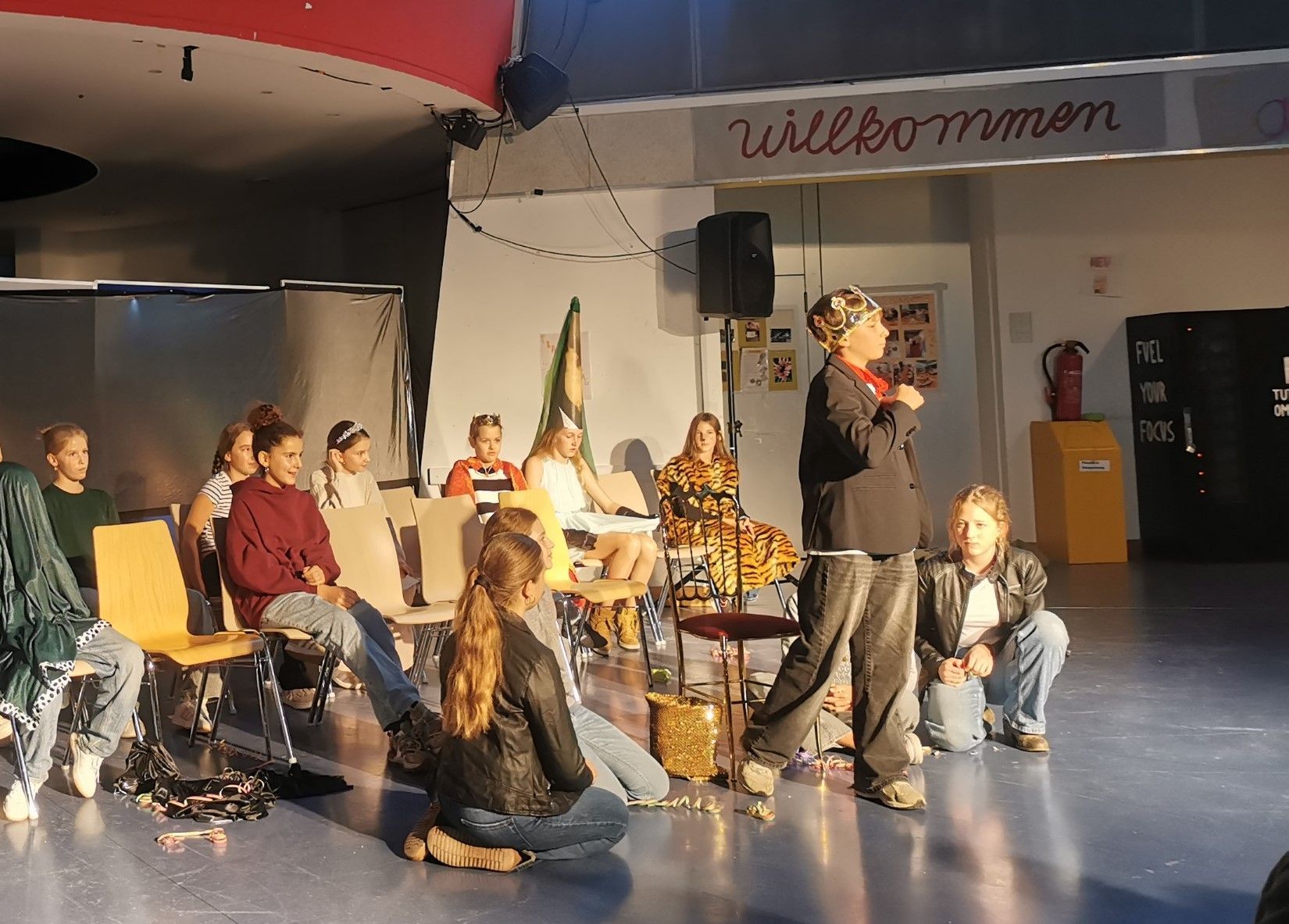 Bevor der Elternabend begann, verwandelte sich die Aula in eine kleine Theaterbühne: Die Klasse 7a präsentierte unter der Leitung von Margit Kleber drei klassische Balladen und sorgte damit für einen stimmungsvollen Auftakt. Den Beginn machten „Die Goldgräber“ von Emanuel Geibel. Die Szene zeigte eindrucksvoll, wie der Traum vom schnellen Reichtum in Enttäuschung und Leere endet. Anschließend folgte „Belsatzar“ von Heinrich Heine: Die Schülerinnen und Schüler stellten die prunkvolle Feier des babylonischen Königs und seinen plötzlichen Untergang lebendig dar. Den Abschluss bildete „Der Handschuh“ von Friedrich Schiller – eine Geschichte über Mut, Eitelkeit und eine gewagte Liebesprobe am Königshof. Eltern, Lehrkräfte und Mitschüler verfolgten die Aufführung aufmerksam und spendeten begeisterten Applaus. Ein gelungener Einstieg in den Abend, der zeigte: Literatur kann richtig lebendig werden.