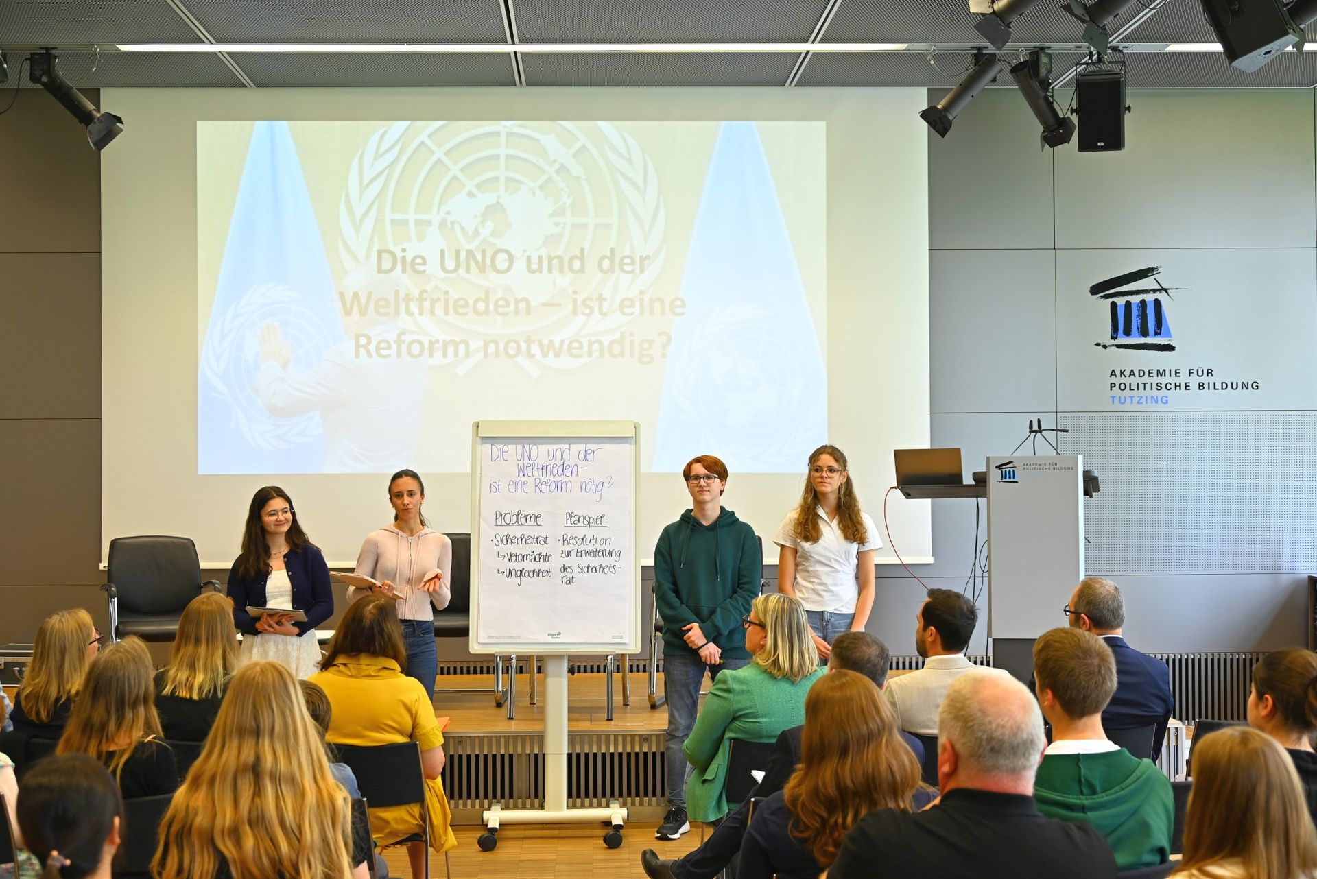 Das Team vom Gymnasium Tutzing, dem Magdalena Böhm, Antonia Diestelkamp, Luisa-Mareen Gerum, Maximilian Haes und Louisa Sundermann angehörten, ging in Anbetracht aktueller internationaler Konflikte dem Schwerpunkt „Die UNO und der Weltfrieden – Ist eine Reform notwendig?“ nach. Methodisch bereitete die Gruppe dazu unter anderem ein Planspiel vor, das eine Debatte der Generalversammlung über einen Vorschlag für eine Reform des Sicherheitsrats simulierte. Dies führte den Teilnehmerinnen und Teilnehmern vor Augen, wie schwierig eine Einigung ist, wenn Staaten primär ihre Eigeninteressen verfolgen.